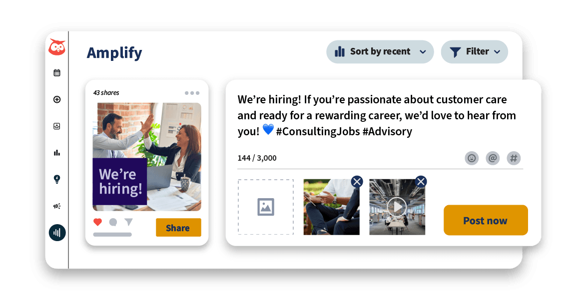 Your people are your greatest asset — and their voices matter. Hootsuite Amplify makes it easy for consultants, advisors, and leaders to share brand-approved content that amplifies your firm’s expertise and culture. Empower your professionals to represent your firm confidently while staying fully compliant.