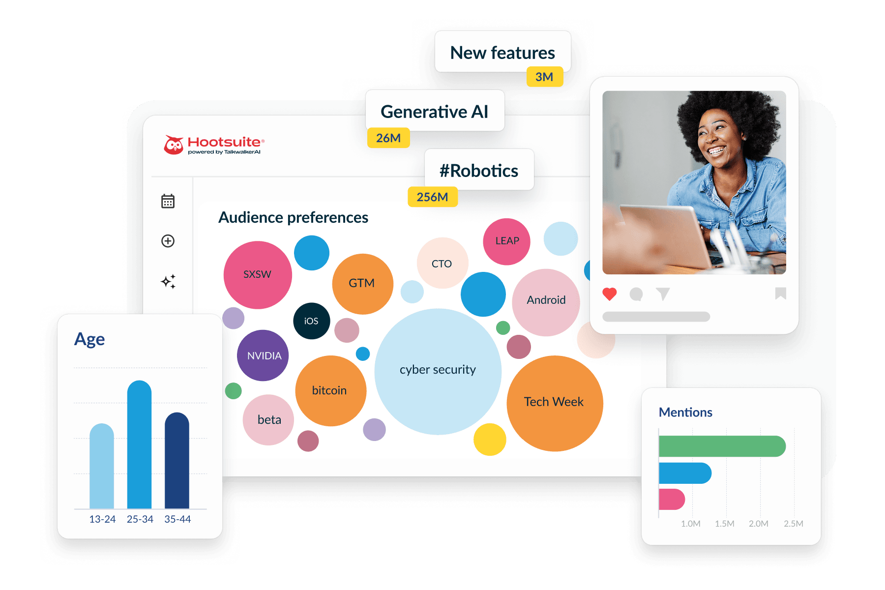Hootsuite interface showing colorful bubbles with tech terms like SXSW, NVIDIA, and cyber security, with audience preferences and AI features