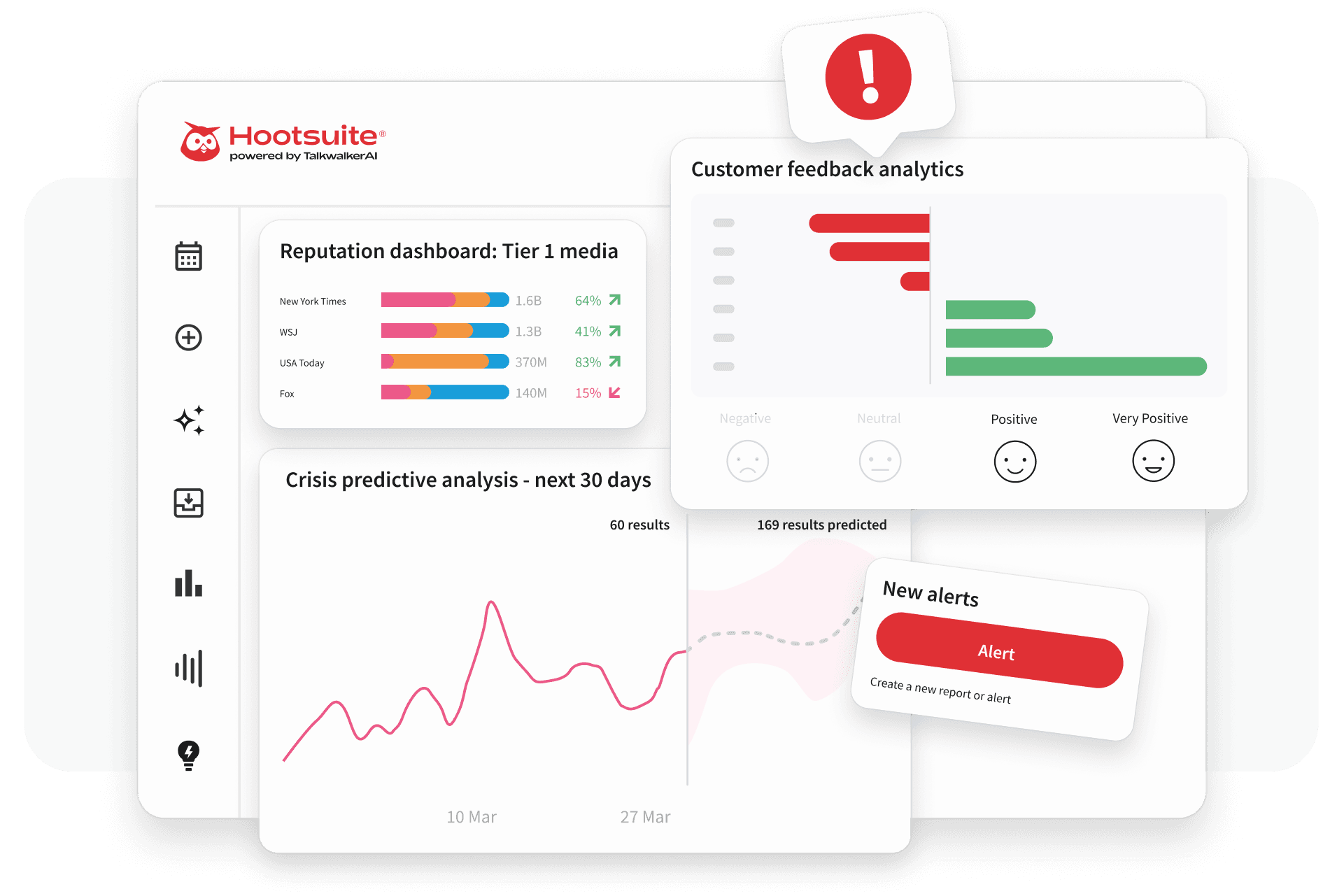 Corporate reputation management is the practice of monitoring and influencing how the public, customers, investors, and employees perceive your brand. Hootsuite powered by Talkwalker AI helps by providing real-time media monitoring, sentiment analysis, and issue detection across all channels — so you can protect your corporate image and respond quickly to emerging risks.